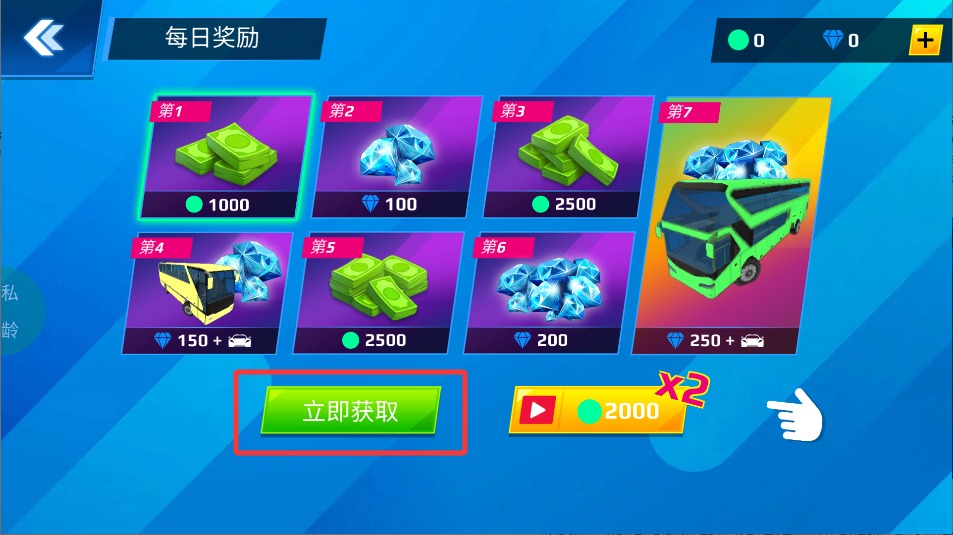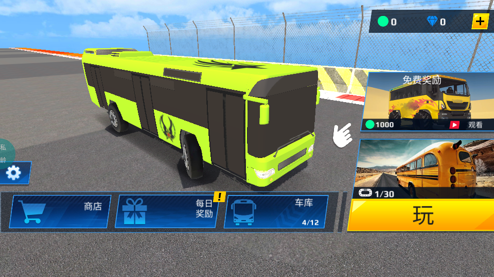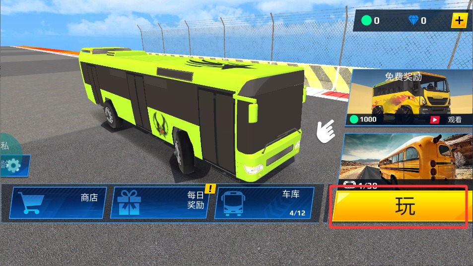 1、进入游戏,在车库选巴士,点【玩】开始。可看广告领免费奖励,解锁新巴士。