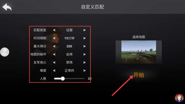 2、在自定义匹配界面设置参数,点击【开始】进入对战。