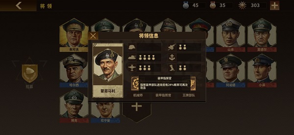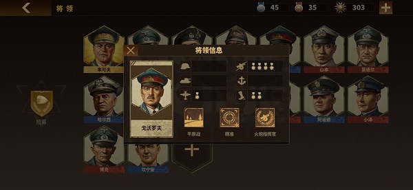 首先说将领。应先明确,本作主力仍为装甲和火炮。理由无需多言,从实战阵型来看,原则上装甲冲前排顶住火力、趁势收割,火炮后排先手输出减轻前排压力,这是典型的配置。