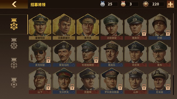 最后讲步将吧。步将选择比较多,个人认为轴心山下,同盟艾森豪、麦克阿瑟、斯利姆。龙德施泰特看似有个补给掠夺能吸血,但实测作用比较小,不如直接补兵来得快。这个技能位置还不如留给其他输出技能。山下应该是本作步兵单兵能力之王,攻守兼备,不二选择。麦克阿瑟输出比较暴力,但生存能力相比欠佳,应注意先让前排吸引火力。斯利姆我感觉很不错,因为预备队的原因,生存能力很强,在太平洋上守岛游刃有余,此外输出也不赖。