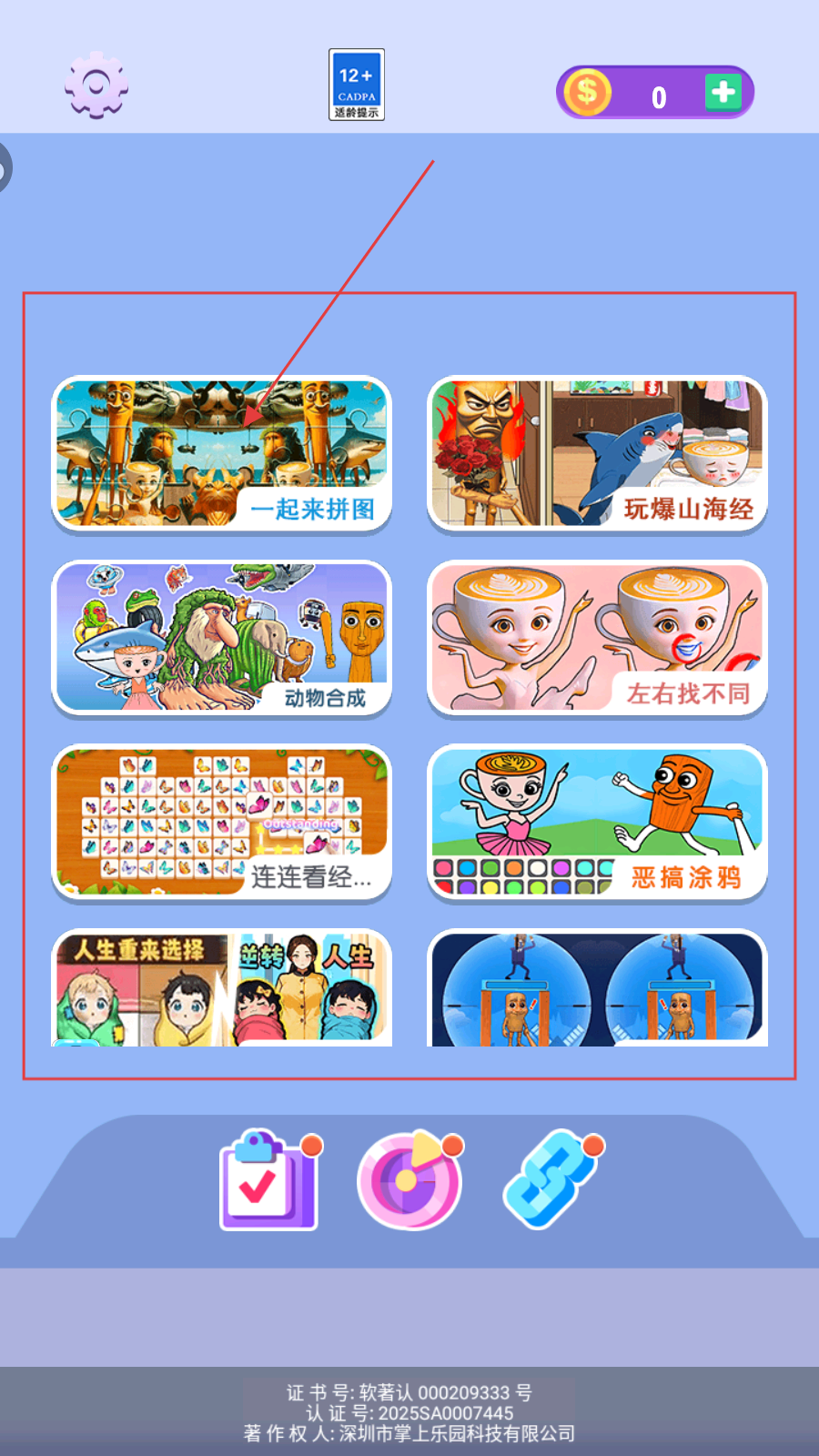 1、主界面选【一起来拼图】,进入第1关,准备拼装彩色碎片。