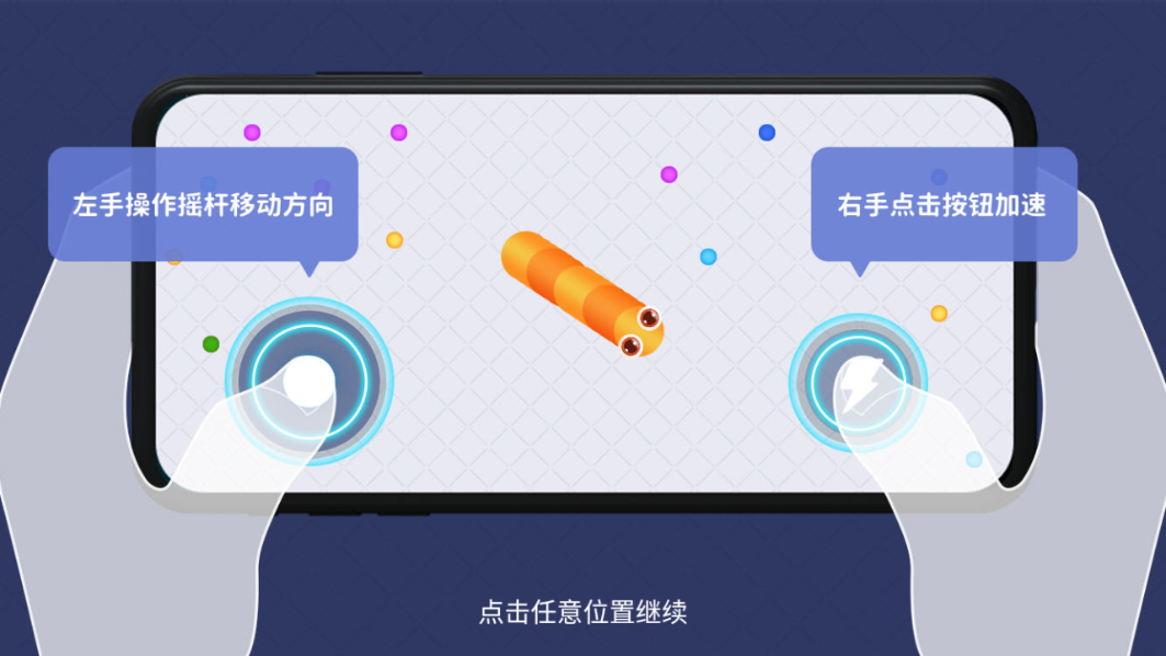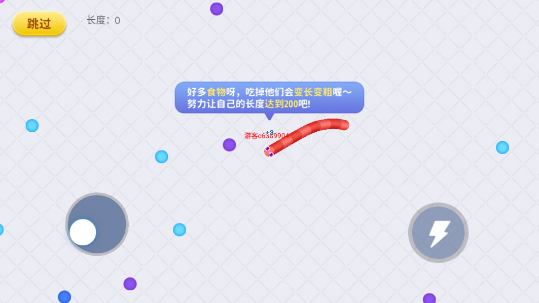 1.控制摇杆走位你的小蛇,吃掉地图上彩色的小圆点,就会变长。