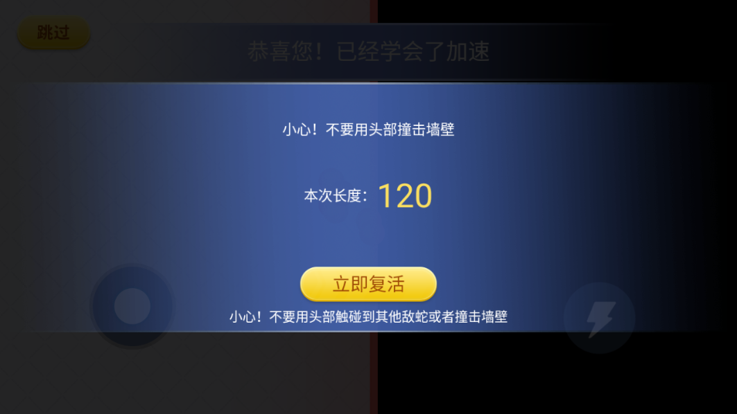 2、然后就会进入一段游戏教程,可以帮助玩家更好地熟悉游戏玩法;左边的按钮控制蛇移动的方向,而右边则是加速;