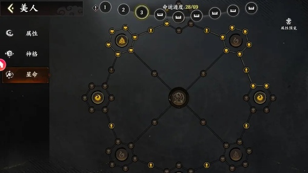 星命可以提升全体武将的属性。所有美人共享星命,每个星命页包含多个星命。星命分为:普通星命与终极星命。必须激活星命页内全部普通星命才能激活终极星命。激活终极星命可以解锁新的星命页,提升美人主动技能等级、提高美人等级上限。