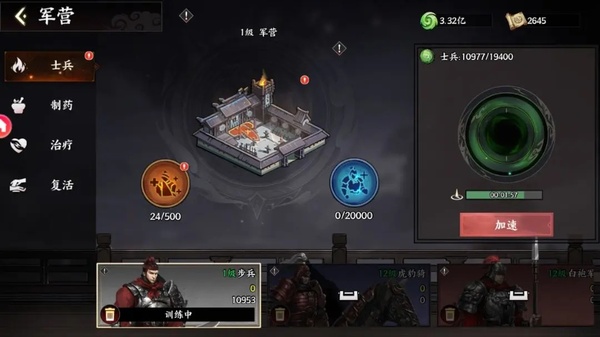 军营可以花费资源训练士兵,携带士兵作战会极大加强武将的能力,且能保护武将使其所受到的伤害降低。士兵只能在天下中使用,在战斗中,士兵会随着武将受到伤害而损耗。