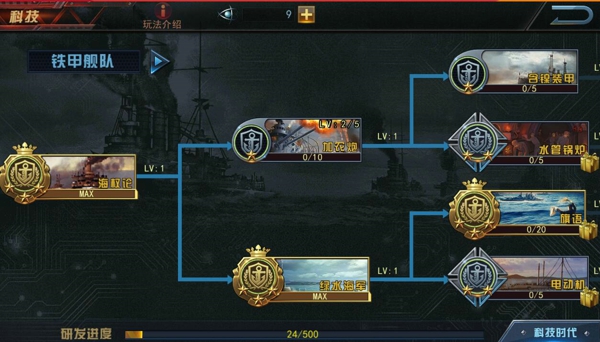在科研中心中,我们能直观看到海上科技的变化,游戏中共分为4个科技时代,分别是铁甲舰队时代、无畏之海时代、海军假日时代和激战海空时代。