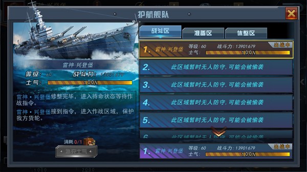 在作战时,要注意及时补充自己舰队的士气,如果士气消耗光,则会进入休整区进行休整。休整完毕才会重新进入准备区,随时准备出战。