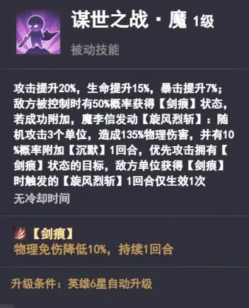 攻击提升20%,生命提升15%,暴击提升7%地方被控制时有50%概率获得【剑痕】状态,若成功附加,魔李信发动【旋风烈斩】:随机成功攻击3个单位,造成135%物理伤害,并有10%概率附加【沉默】1回合,优先攻击拥有【剑痕】状态的目标,敌方单位获得【剑痕】是触发的【旋风烈斩】1回合仅生效1次----无冷却时间