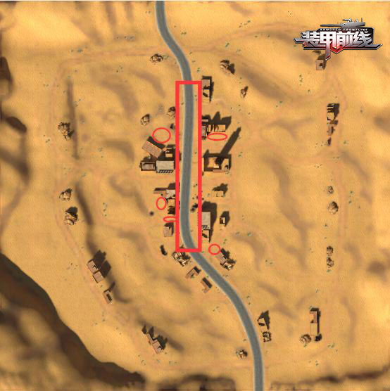 地图选用的是一张沙漠地图,比较符合现代战争的风格,地图两边是高坡,给步战车以及八轮突击炮提供了不错的侦查以及黑枪的位置,用方块圈出的位置如果可以抢下来,那么不管是视野还是火力压制都有着明显的优势,圆圈都是一些黑枪的点位