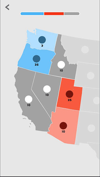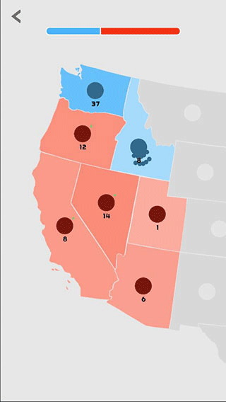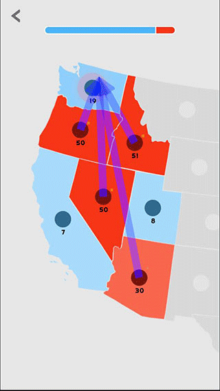 3、点击拖动地图块中间的圆点,即可表示派遣单位进行攻击扩张,圆点旁边的数字表示单位数量,单位数量会随着时间自动增长,数量越多,地图块的颜色也就越深。