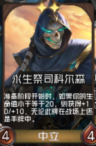 【永生祭司科尔森棋子】棋子等级由3 → 2,属性由5/5 → 4/4,技能修改为准备阶段开始时,如果你的生命值小于等于20,则获得+10+10/+20+20/+30+30,无论此牌在战场上还是手牌中。