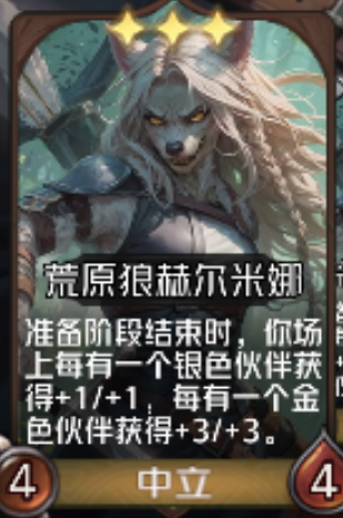 【荒原狼赫尔米娜棋子】技能修改为准备阶段结束时,你场上每有一个银色伙伴获得+1+1/+2+2/+3+3,每有一个金色伙伴获得+3+3/+6+6/+9+9。