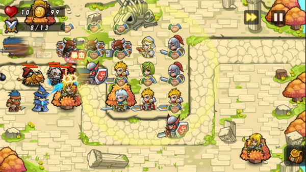 初始阵型:中级的减速法师比初级强不少,优先升·好,一个卫士是必要的,前期放3个小偷可以让经济更快,然后随意找两棵树蹲好弓箭手就行了