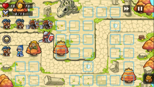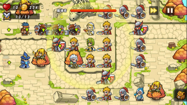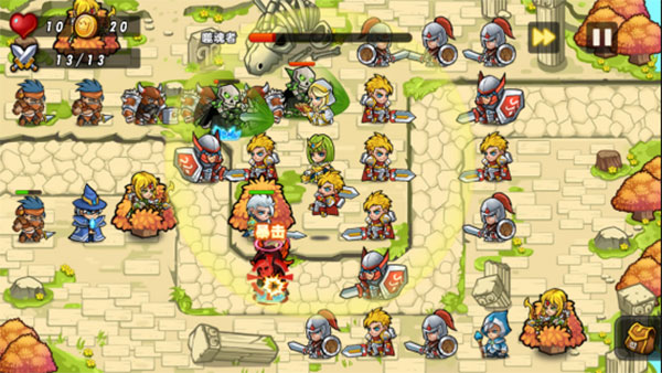 最终阵型:优先把护卫放满,然后升级树上的神射手,再然后优先把护卫旁边的大剑士升出来(护卫旁边boss停留时间长,输出环境好),富余的钱如图把所有剑士连成一片,团结起来!