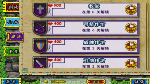 每场战斗结束后都会获得金币,金币除了可以建造防御设备和招募士兵以外,还可以用于新兵种和设备的解锁和升级,从而增加士兵和建筑的属性。本作的强化系统比较单一,只是对单个兵种或建筑进行强化,选择难度不大。但是强化对防守的作用还是很明显的,玩家可以自由强化士兵和设备,用来缓解守护城堡的压力。