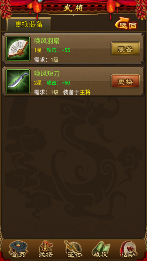 消耗金币强化装备,获得更高属性,强化后售价也将提高,通关战役能获取紫色以上装备,有更高的属性,不要浪费每天的挑战次数。圣灵级别以上的装备,可以通过精练提高属性,精练所需图纸可在军团商店购买。