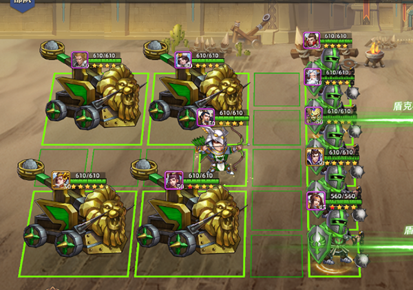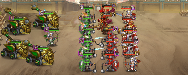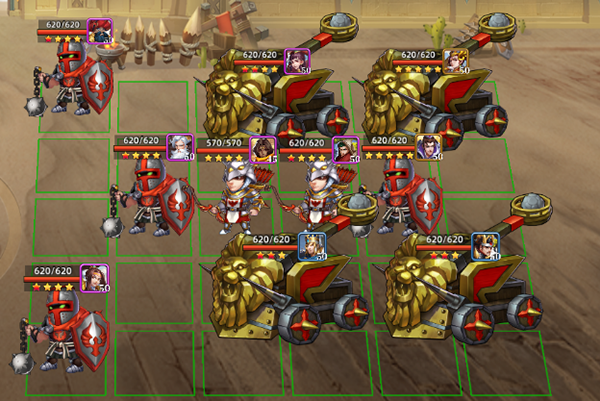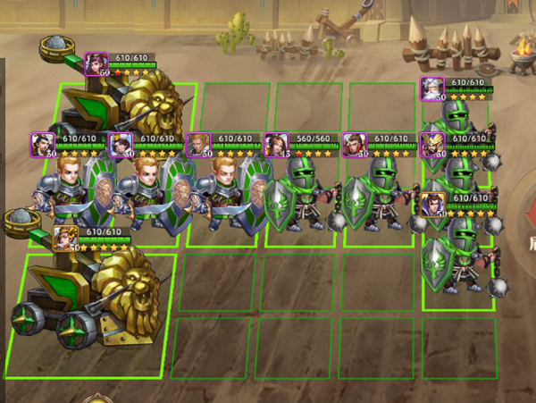 该阵型不仅在攻城战里适用,在单挑战斗,以及竞技场战斗中也很实用:能在一定程度上打赢比你战力强的正常阵容对手。