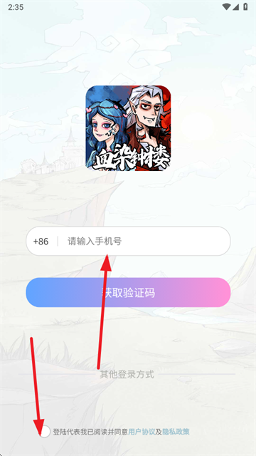 3、输入手机号获取验证码,勾选用户协议和隐私政策