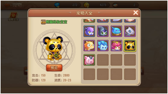宠物由基本的几样属性构成,等级,资质,星数,技能,羁绊。每个都缺一不可,等级通过消耗其他宠物和金币进行升级,最好的宠物素材就是熊猫经验宝宝和小猪经验宝宝哦,这两个宠物可以在宠物经验蛋中获取到