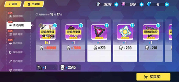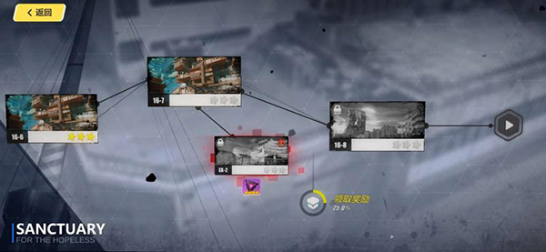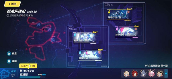 特殊玩法,主线剧情解锁第六关后开启,玩家每天有4次机会挑战特殊关卡,完成后可获得材料以及避难所的等级。避难所等级越高每小时收获的活动材料也就越多。当使用up女武神出战后会获得额外的积分奖励。荒芜之城