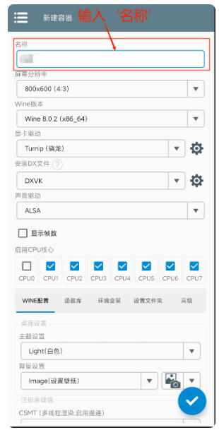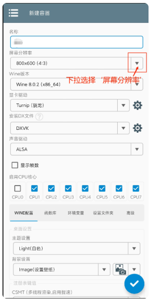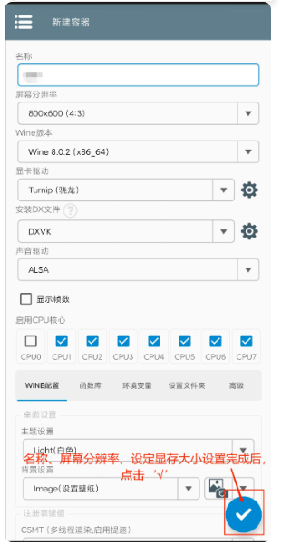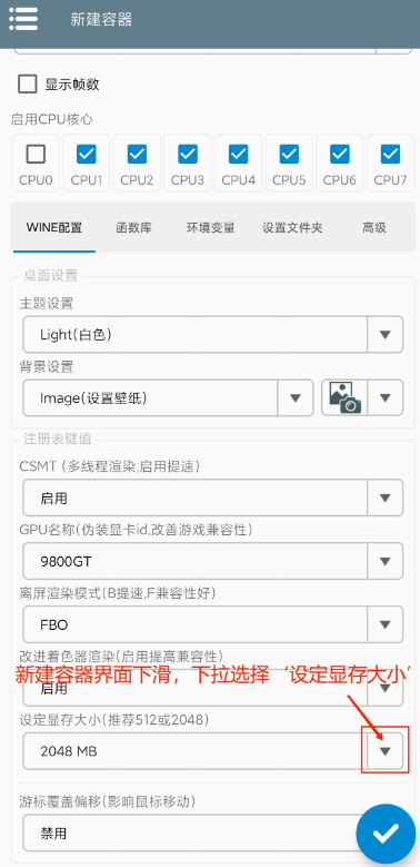5.新建容器界面下滑,下拉选择‘设定显存大小’(建议手机配置较低的,显存大小调小点)
