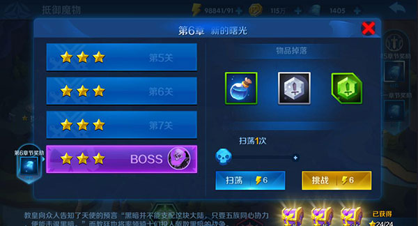 1、游戏拥有30个章节,270多个各种难度的关卡,消耗体力值来挑战,挑战失败不扣除体力,挑战胜利才扣体力,过关后有概率掉落符石,通关每个章节都可领取到章节奖励。关卡满星通关后可以获得宝箱奖励。满星后可进行扫荡,快速获取材料。