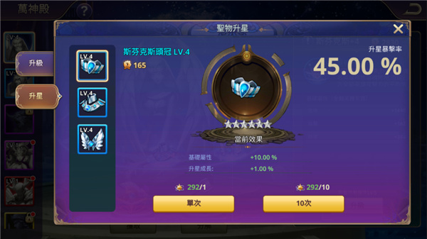 每提升1个小阶段,属性都会有有一定提升。升星暴击率:获得2倍升星进度的概率,随着阶段和星级的提高,暴击率会逐步降低,每次消耗的星魂石也会增加。