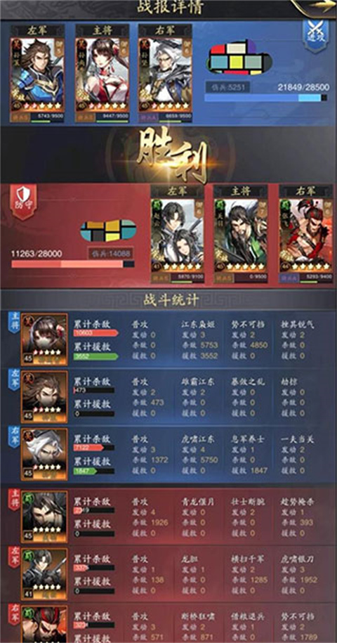 三孙队伍有一定红度技能配置比较奢华,比如反戈一击劫掠等都是S级技能。输了的原因在于:1、孙策武力属性不是很强,劫掠和暴敛之乱没有打出较高的伤害;2、孙尚香比较脸黑被对面的孙尚香爆头;3、孙坚的技能有点尴尬,反戈一击受到武力伤害叠加层数,孙坚江东猛虎带有两次守御会抵挡伤害,其次息军养士大量恢复兵力无法打到反击临界点,兵力的40%;4、对面有减伤和破防,这一战报主要是为了说明孙尚香【江东解烦】打骑兵的效果,一发技能将近5000伤害
