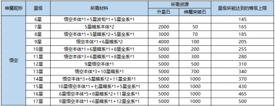 悟空属于SSR神魔,所以在升星上除本体外还需要暗系狗粮。所以大家在日常培养中一定要时刻留意积攒暗系狗粮,下面附上悟空每个星级升星所需材料: