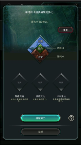 根据卡牌所属的种族势力目前一共有三个阵营势力(阿德贝格、波特艾伦和卡尔里拉),玩家在搭配卡组的时候可选择一个或者多个阵营势力来进行构建。因此玩家可以搭配不同的战术。单一阵营和多阵营搭配各有优劣,同时搭配多个阵营相关势力的会被分为主要,次要和重点,相应的会受到法耗增加的惩罚。如主要势力召唤的费用为正常值。而次要势力的召唤费用会在基础上+1,第三势力(重点,吐槽策划这里为什么要叫重点,是因为在中间嘛,哈哈)的召唤费用会+2。而如果只有一个势力的卡组,我们称为纯色卡组,不用享受法耗惩罚,而且在第一回合能多抽一张卡牌。我们后续会不断增加卡组和势力,提高策略的广度和深度。