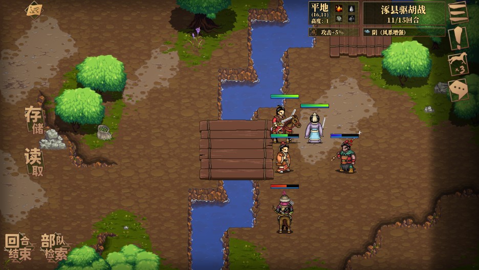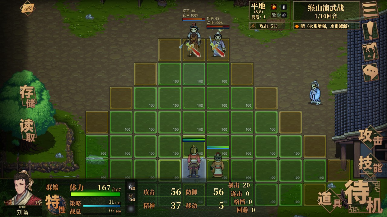 点击武将即可控制武将行军位置,可在界面查看武将信息以及技能介绍。每次行动只能选择一个操作(技能/攻击)然后结束回合!请根据实际情况进行战棋调整