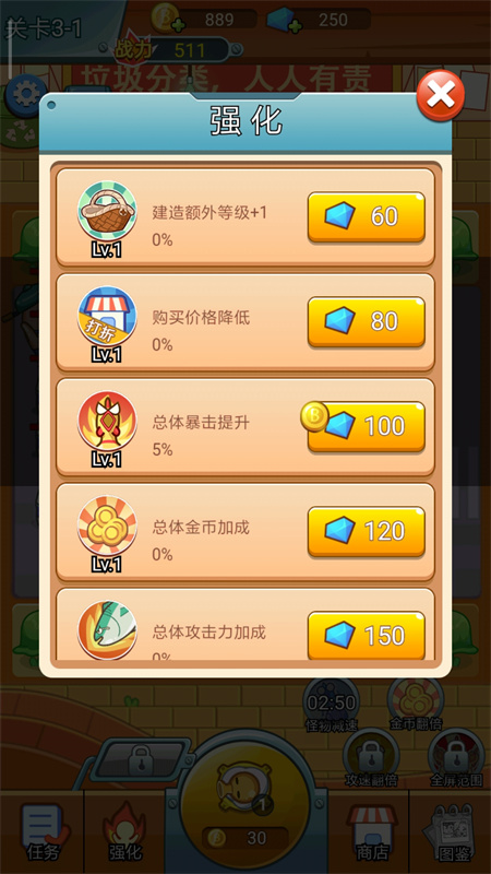 4、同时也要注意炮塔的位子,不然敌人太远射不到,你也可以购买道具强化武器,击败一波可以获得金币加成,也可以点击移动炮塔,查看它们的攻击力和级别等,需要快速升级将可获得胜利;