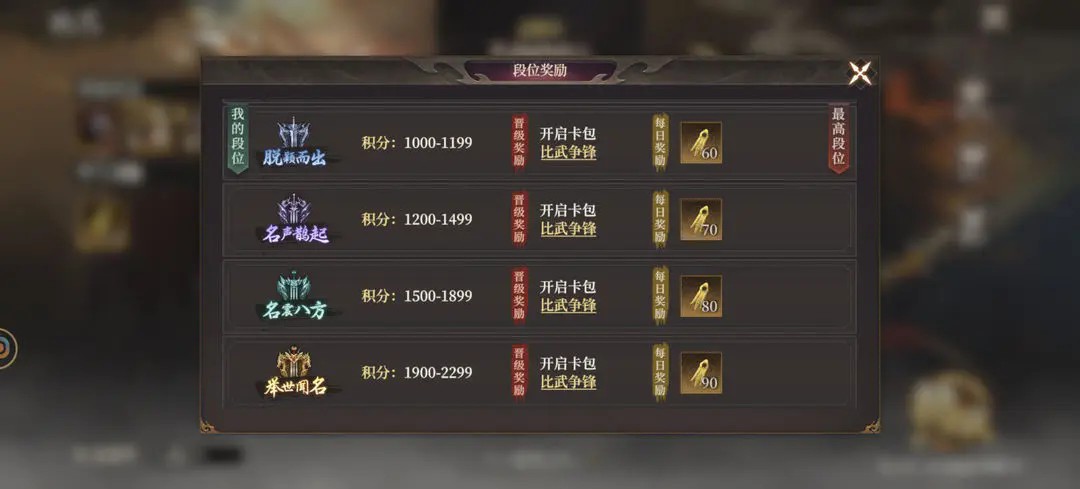 2、战斗胜败会影响总体积分,积分决定段位奖励的多少,当前有初出茅庐、脱颖而出、名声鹊起、名震八方、举世闻名、震古烁今共六个段位,每赢取300积分,段位提升一个阶段,每次晋级都可以获得一次额外卡包开启的机会。另外还有50-100的比武币奖励,每提升一个段位,比武币奖励增加十个。