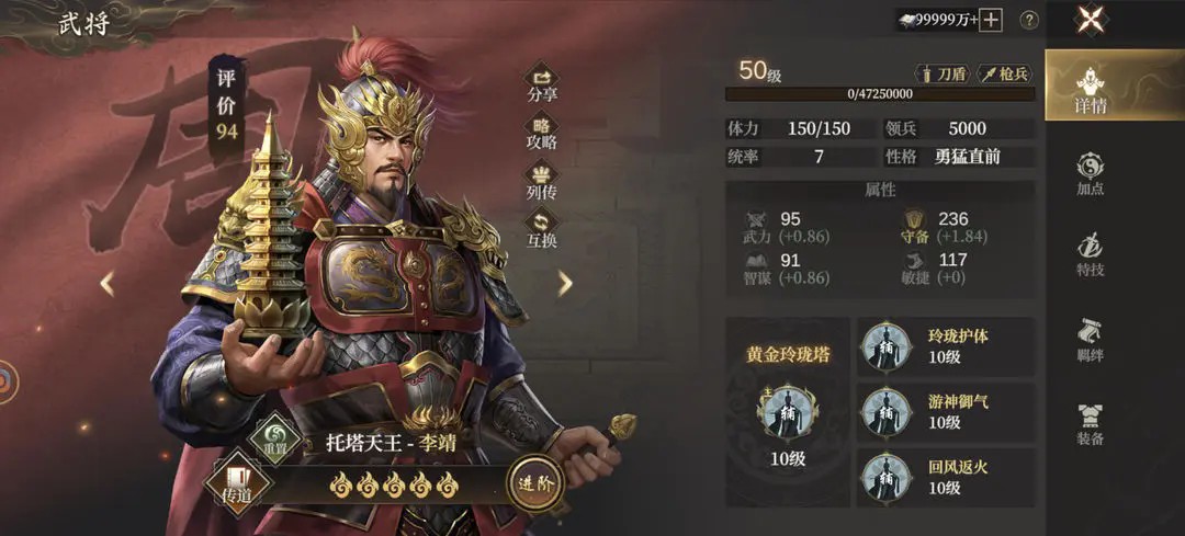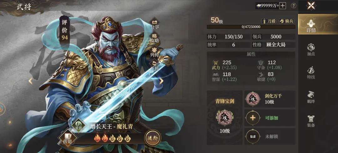 同时在招募中获得的武将都可进行武将培养,诸位将军可选择任意武将进行升阶、加点。也可点击武将详情查看当前武将所携带的术法和激活的天赋。