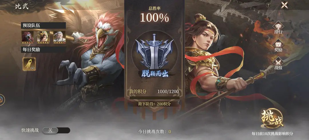 1、比武挑战系统是检验玩家养成程度的标杆,战斗中玩家们无法操控队伍,所以胜败只取决于武将本身的硬实力和阵容搭配带来的属性加成。