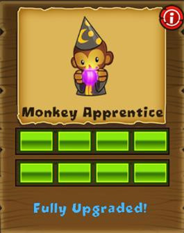 (每发飞镖可以攻击2个气球)→(每发飞镖可以攻击3个气球)→(每次可以发射三枚飞镖)→(增加“变身”技能,把攻击范围内的飞镖猴变成超猴)