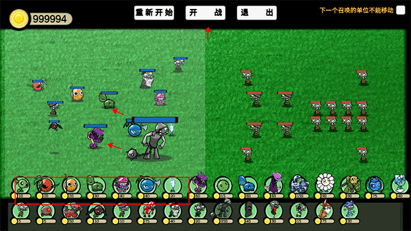 3、我们需要将下方的植物拖到左边的阵营,玩家可以自由加入各种植物,放置完成后点击上方的开始即可
