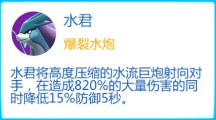 水君将高度压缩的水流巨炮射向对手,在造成大量伤害的同时,降低敌人15%防御,持续5秒。