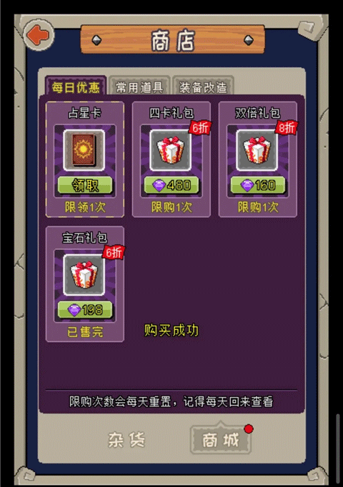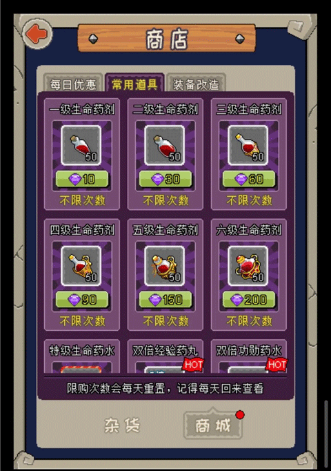 新人一定要注意哦。钻石一定一定不要乱用,这里推荐性价比比较高的使用指南,那就是购买商店的每日优惠这里有两个礼包,双倍礼包和宝石礼包,个人推荐每天可以买一个宝石礼包,双倍礼包可以不用买,毕竟看广告也可以获得双倍药水。