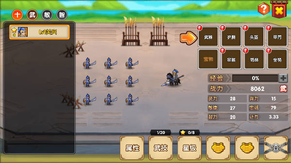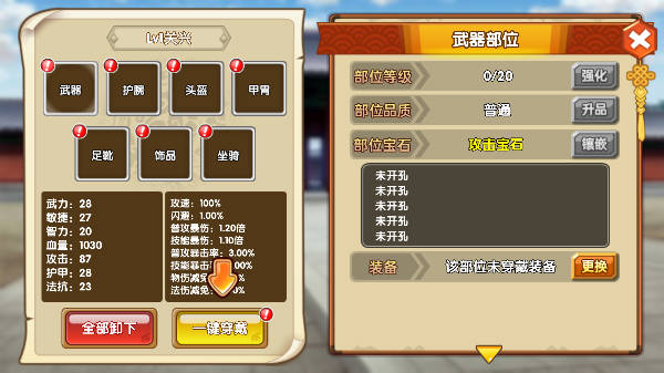 武将部位强化和升品是跟随武将的,只有装备精炼是跟随装备,所以不用担心换装备了会掉。强化和升品主要升武器和马,只要解锁强化材料就可以直接拉到顶,其他部位前期可以先不用管,补成功率的材料要么就不放,要么就元宝买满,不然这个游戏的成功率会直接劝退。