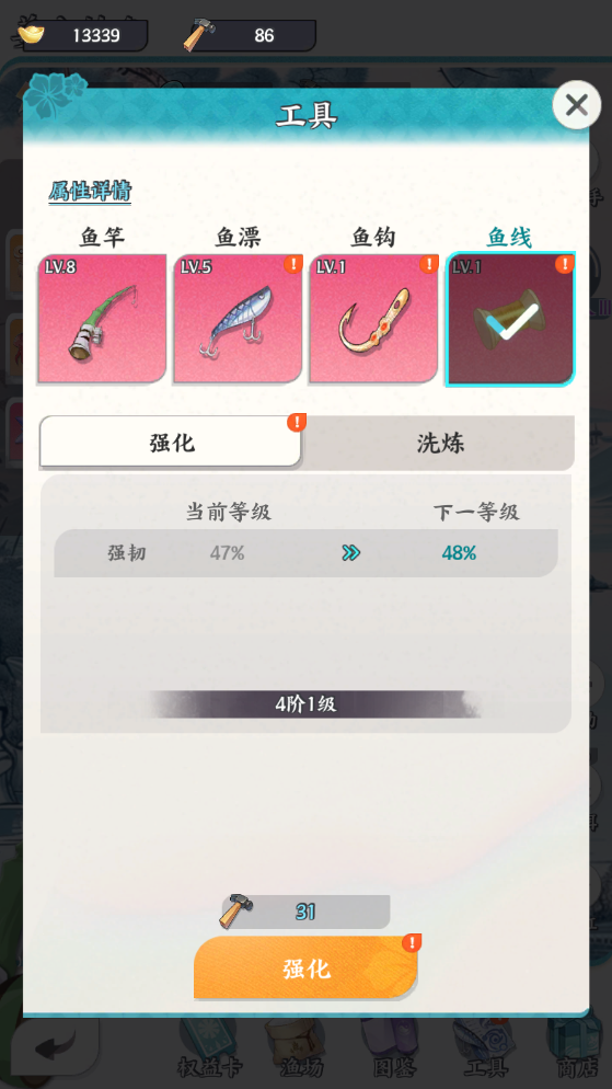 2、渔具升级优先级:鱼竿(提高鱼尺寸及出售物品金额)>鱼漂(降低鱼逃跑几率)≈鱼线(降低鱼线被挣脱几率)>鱼钩(提高鱼饵的属性加成)