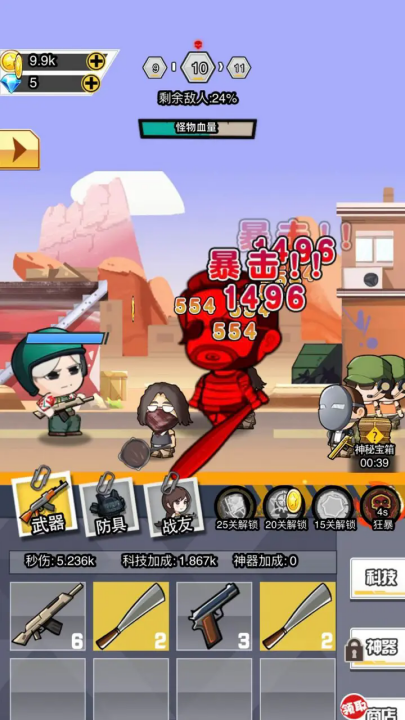 吃鸡之路小游戏是一款横版射击合成类游戏。游戏玩法轻松有趣,里面的装备只需要一步步合成就可以升级变强,全自动打怪,也不需要你阿里操控,各样门类齐全的吃鸡武器自由解锁,让你的战士装备精良让战力飙升。吃鸡之路小游戏操作超级简单,不断合成更强的枪和防具是你吃鸡最简单的办法,流畅又有趣的游戏体验,合成挂机二合一,离线也有金币拿,非常的有意思。