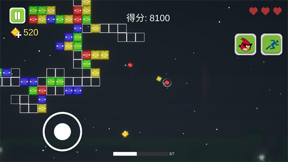 4、屏幕的右上角是玩家的血量,每触碰一次方块就会减少一颗心。