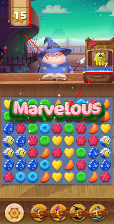 3、关卡过关:在指定的步数内,完成消除目标即可过关,但是步数用的越少就过关,分数就越高,星星也就有越多;