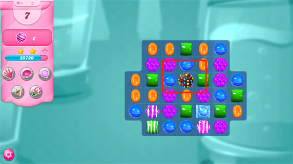 5、继续尝试将相同颜色形状的三颗糖果排成一行;