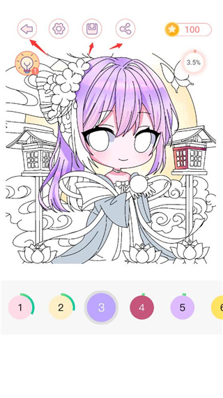 6、选择箭头符号可以返回,第三个可以保存当下涂色,第四可以分享给你的小伙伴分享。