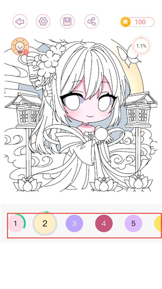 2、进入涂色界面后,点击上方的设置图标,点击右侧的开关即可关闭啦。