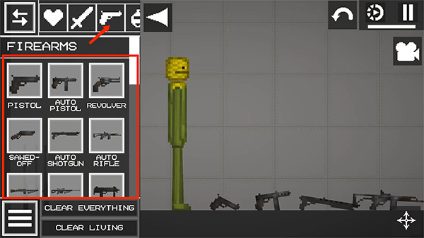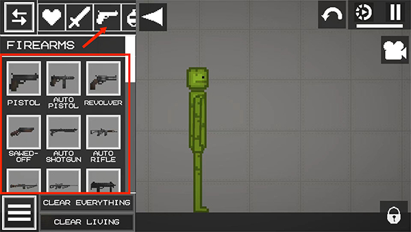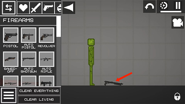 3、接着,我们在菜单界面,选择【枪】图标,选择一把拖动到地面上,