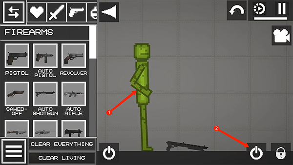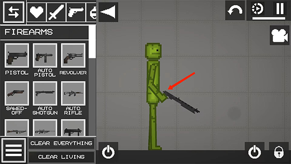 5、如图,可看到西瓜人物手里已经拿着枪了,点击按钮可以进行射击,以上就是让人物拿枪的教程了。