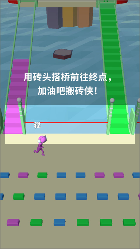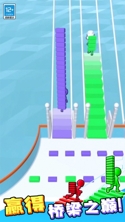 2、用收集的砖块来搭桥到达下一个平台,同时还要保证不能让别人攻占你的桥梁,你可以选择一次性收集足够的砖块来打造好桥,最先到达终点即可获取胜利。